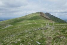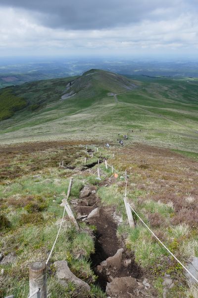 2e jour, départ du col de Serre que nous rejoignons en voiture. Le ciel est plutôt dégagé. Nous montons en suivant la hétraie en parallèle de la route vers le col d’Eylac. Au loin, le Puy Mary garde un chapeau de brume. Direction le Puy de Peyre Arse en passant en contrebas des crêtes et de la Brèche de Rolland. Ça souffle et il ne fait pas chaud ! Nous descendons ensuite vers le col de Cabre où nous trouvons un coin abrité du vent pour pique-niquer. Puis descente dans le vallon vers Lavigerie, où les nuances de vert s’exhibent magnifiquement.